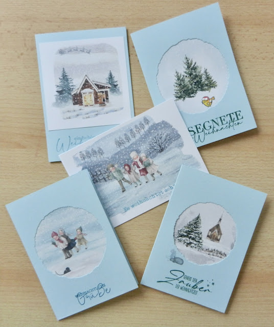 Alle Karten haben einen himmelblauen Kartenrohling, aus dem ich einen Kreis auastanzte.